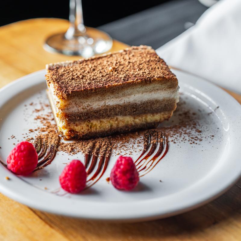 Italian limoncello cream cake with a raspberry sauce and mascarpone cream