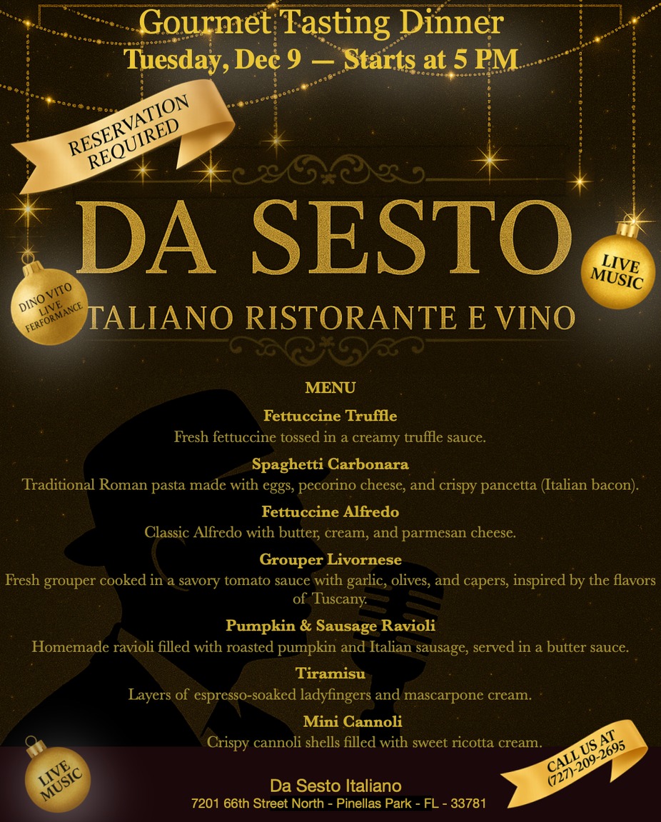 An exciting and refined menu, specially crafted for this exclusive evening, will guide you through an unforgettable culinary journey. Experience a truly unique night: authentic Italian flavors, a warm and welcoming atmosphere, and the timeless charm of old–New York Italian restaurants. A one-of-a-kind emotion not to be missed.
